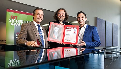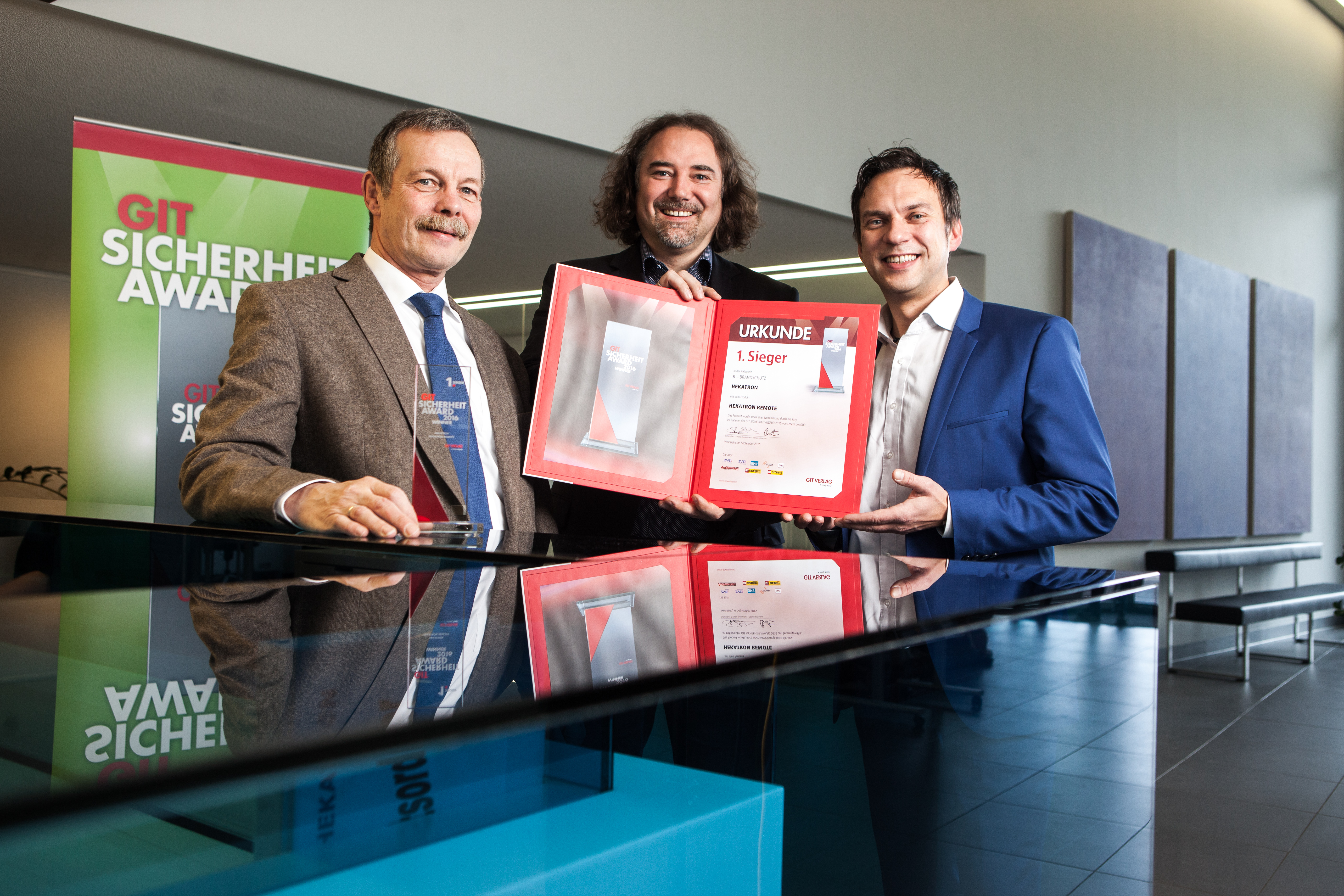 Die vierte Systemvariante heißt HEKATRON Remote Mobile. Bei ihr ist die VirtualMap in eine App eingebettet, die auf einem mobilen Endgerät – Smartphone oder Tablet – läuft. Damit deckt HEKATRON Remote zielgerichtet genau das ab, was Facherrichter und BMA-Betreiber sich von einem Fernzugriff wünschen. Das ist allemal eine Auszeichnung wert. Bild: Freuen sich über den von Steffen Ebert (rechts), Verlagsleiter GIT-Verlag, verliehen Preis. Dietmar Hog (links), Geschäftsleiter Brandmeldesystemtechnik, und Andreas Seltmann, Geschäftsleiter Marketing.