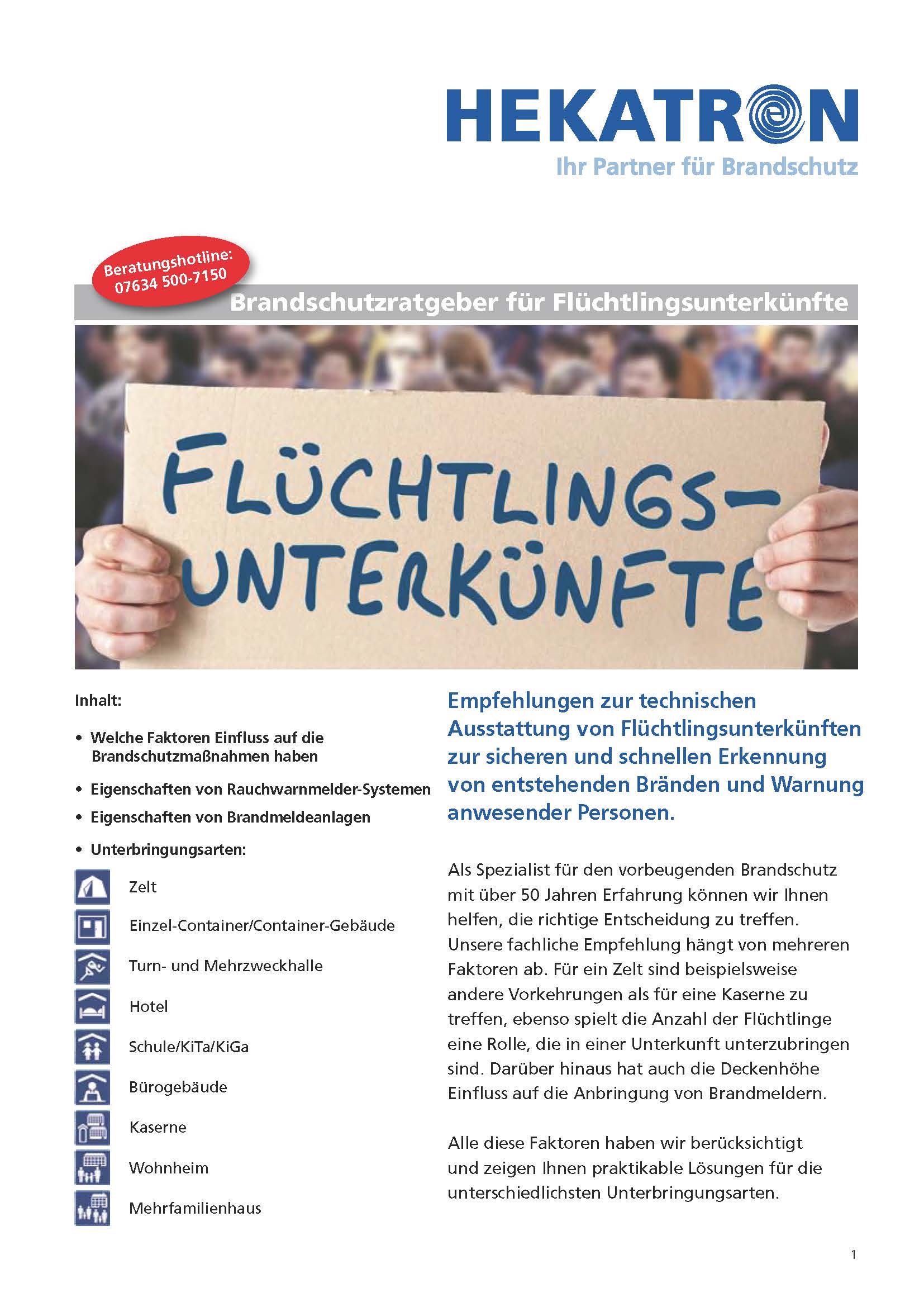 Brandschutz in Flüchtlingsunterkünften 2015 werden über 1 Million Flüchtlinge in der Bundesrepublik erwartet. Damit stehen die Kommunen vor enormen Herausforderungen. Die drängendste Aufgabe zurzeit: Wo bringen wir die Vielzahl der Menschen angemessen und sicher unter? Gerade für den Brandschutz sind hierbei viele Aspekte zu berücksichtigen. Eine Arbeits- und Entscheidungshilfe des Brandmeldespezialisten Hekatron erläutert, welche Faktoren beim anlagentechischen Brandschutz zu beachten sind.