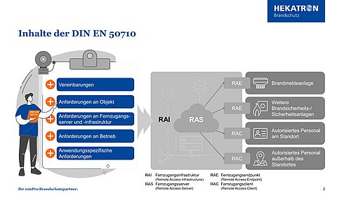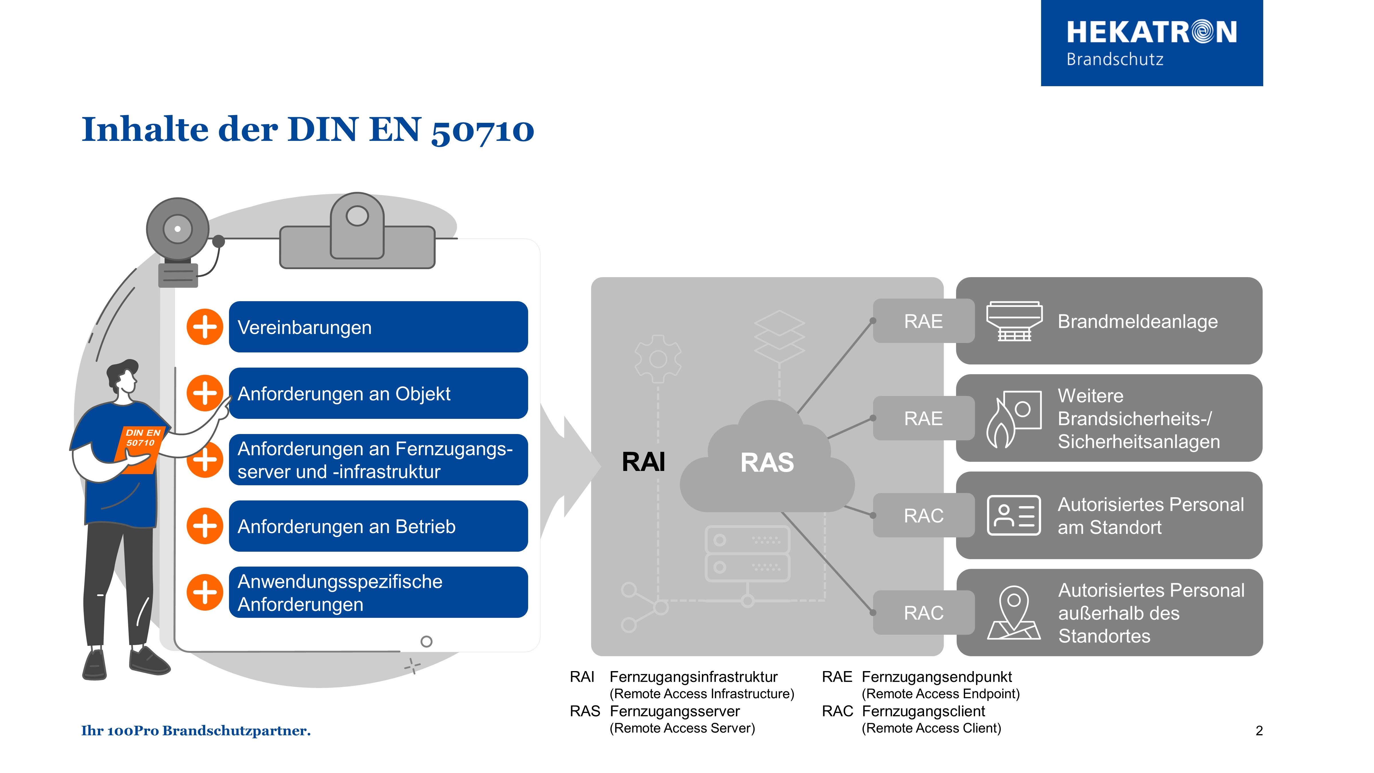 ie neue DIN EN 50710 gilt nicht nur für Brandmeldetechnik, sondern auch für die Gewerke Zutritt, Rauchwärmeabzug, Einbruch und Social Alarm. Sie fokussiert insbesondere auf den Anforderungskatalog, den ein Dienstleistungsanbieter erfüllen sollte, wenn er Fernüberwachung oder -instandhaltung anbieten möchte. „So soll beispielsweise über ein Verwaltungssystem und passwortgeschützte Bereiche im Computer exakt geregelt werden, welcher Personenkreis Zugriff auf das System hat“, weiß Litterst. Auch die Zugriffsart muss demnach klar definiert werden. „Während die Hinweise zur Systemauslesung für eine Statusabfrage im Normentext allgemein gehalten sind, muss vom Errichter nun eindeutig festgelegt werden, wer im Rahmen von Programmierungen aus der Ferne Änderungen am System vornehmen kann“, so Litterst weiter. Weil durch mögliche Cyberattacken auch im Bereich der Brandmeldeanlagen großer Schaden entstehen kann, muss eine Fernüberwachungssoftware gemäß der neuen Norm zudem spezifische Tests bestehen, damit von einer sicheren Verbindung ausgegangen werden kann.
