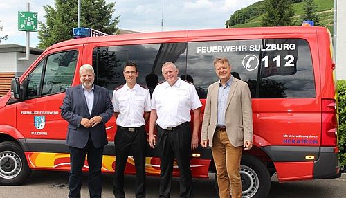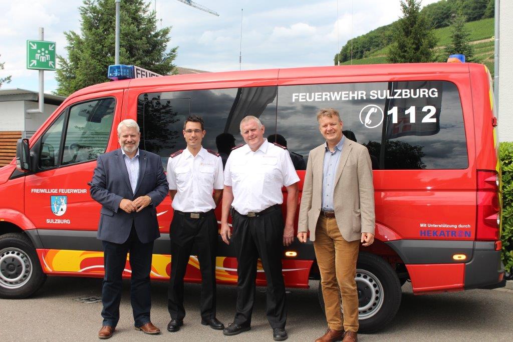 Bürgermeister Dirk Blens und Stephan Grethler, Feuerwehrkommandant der Freiwilligen Feuerwehr Sulzburg, freuen sich. Für die Anschaffung eines neuen Mannschaftstransportwagens (MTW) haben die Hekatron Gesellschaften 5000 Euro gespendet. Doch nicht nur die Spende entlastet das Budget der Stadt Sulzburg. Durch die Weitergabe von Vergünstigungen durch die Firma Hekatron ist das Fahrgestell des MTW um 14000 Euro billiger geworden.