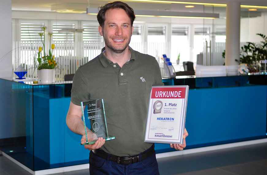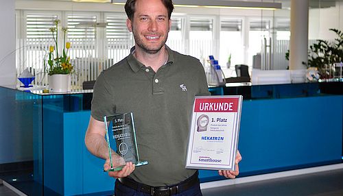 Leser der elektroboerse smarthouse haben entschieden: Genius Plus X ist bestes Produkt 2017. Zum wiederholten Mal haben die Leserinnen und Leser der Fachzeitschrift elektroboerse smarthouse damit Hekatron in der Kategorie „Gebäudetechnik" gewählt. Im Rahmen der Elektrofachmesse eltefa in Stuttgart wurde die Auszeichnung überreicht und heute nach Sulzburg gebracht. David Baum, Produktmanager aus dem Produktmanagement-Bereich „Rauchwarnmelder“ nahm den Preis heute stellvertretend für viele an diesem Produkt beteiligte Kolleginnen und Kollegen heute im Haus im Empfang.