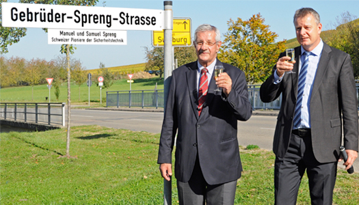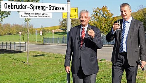 Sulzburgs Bürgermeister Dirk Blens und Samuel Spreng, heute Verwaltungsratsmitglied der familiengeführten Securitas AG, betonten in ihren Lobreden die enge Verbundenheit zwischen Hekatron und der Stadt Sulzburg. Als Hekatron, damals unter dem Namen Pyrotector Europe GmbH, ein Jahr nach seiner Gründung nach Sulzburg zog, wurde das junge Unternehmen mit offenen Armen aufgenommen. Die Stadt bot ihm zunächst Unterkunft in leerstehenden Räumen der Ernst-Leitz-Schule. Mit dem Einstieg der Securitas AG kehrte finanzielle Sicherheit in das Unternehmen ein und eine beeindruckende Erfolgsgeschichte beginnt. Ein Aufstieg von einer Garagenfirma zum Weltunternehmen nannte Bürgermeister Dirk Blens diese Entwicklung in seiner Rede. Samuel Spreng sprach von einem „emotionsgeladenen Tag," da sein verstorbener Bruder Manuel und er nun mit einer Straße geehrt würden. Sein Dank galt der Stadt Sulzburg, die ihnen ermöglicht habe, einen idealen Standort für die Firmen Hekatron Technik und Vertriebs GmbH zu beziehen.