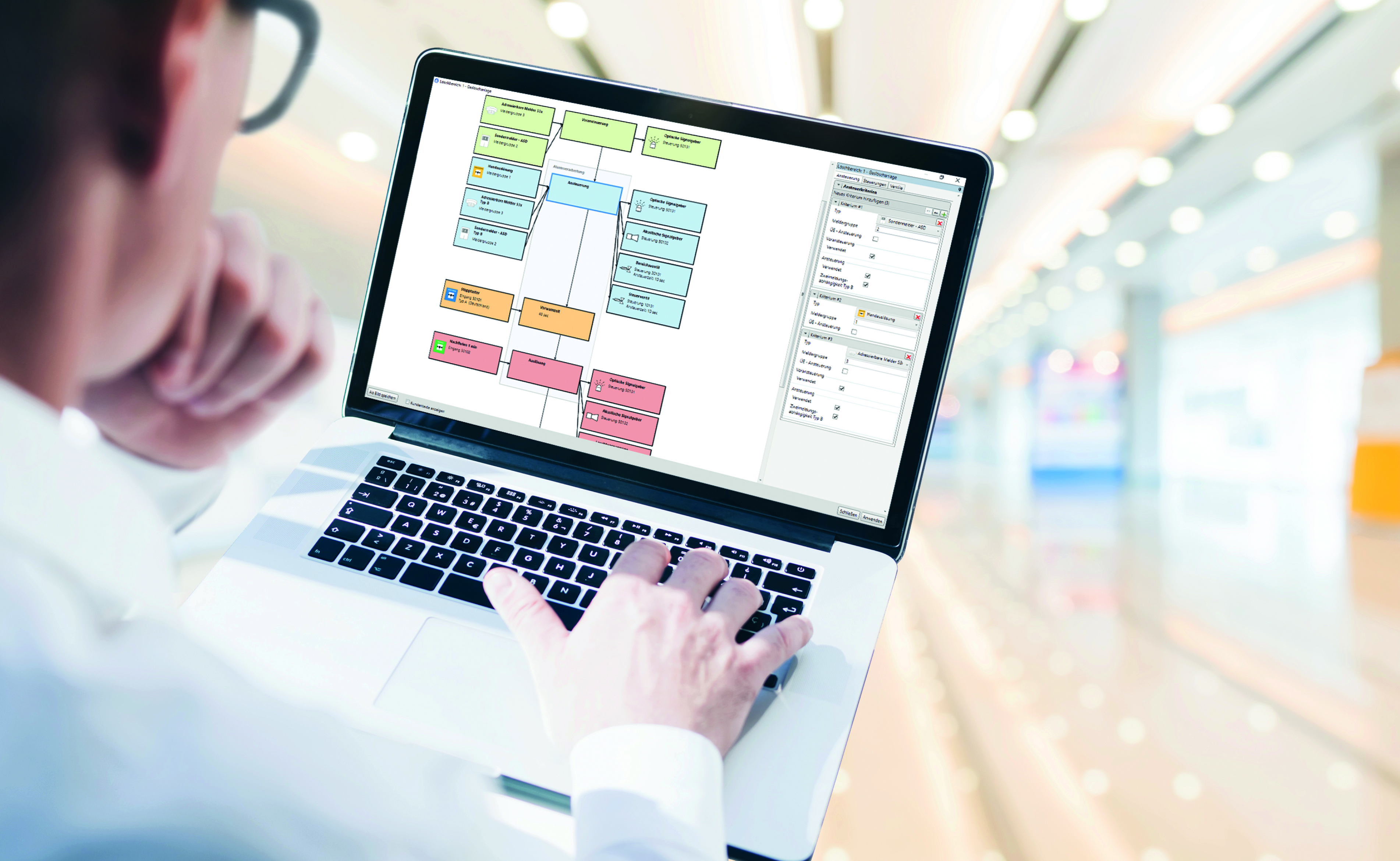 Nach dem Öffnen des Konfigurators erfolgen alle Eingaben logisch aufeinander aufbauend. Hat man den Löschanlagentypen ausgewählt, Wasser- oder Gaslöschanlage, wählt man in den nächsten Schritten aus, was in welcher Phase auf den Löschbereich wirkt und vom Löschbereich angesteuert werden soll. Alle weiteren notwendigen Angaben wie Vorwarnzeit, Ansteuerzeiten, Störmeldungsüberwachungen und Weiterleitungen werden über Dropdown-Listen getätigt. Sämtliche Eintragungen werden grafisch in einem Übersichtsschema dargestellt und können als Grafik zu Dokumentationszwecken abgespeichert werden. Nach der fertigen Parametrierung des Löschbereiches im Löschassistenten wird durch diesen voll automatisiert die Programmierung des Löschbereiches vorgenommen. Die Eingaben im Löschassistenten können jeder Zeit angepasst werden. Bei Löschanlagen mit mehreren Löschbereichen verfährt man analog fort.