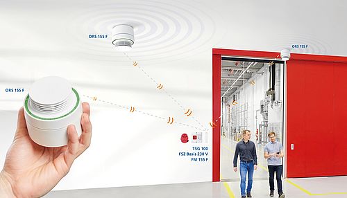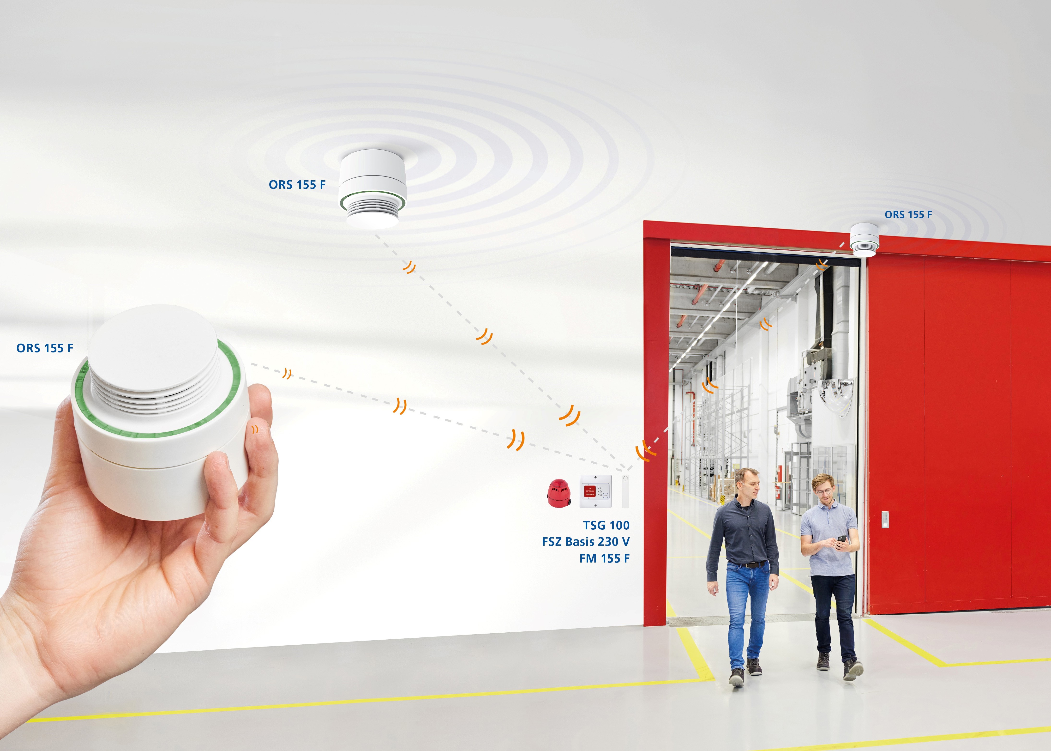 Das System besteht aus drei Komponenten: Dem Funkrauchschalter ORS 155 F, dem Funkmodul FM 155 F als Schnittstelle und einem Funkhandtaster HAT 155 F. Weil aufwändige Verkabelungen durch die Funktechnologie entfallen, kann das System überall eingesetzt werden, auch dann, wenn es sich um ästhetisch anspruchsvolle, publikumsrelevante Bereiche oder denkmalgeschützte Objekte handelt. Auch bestehende Brandschutztüren oder -tore damit nachzurüsten ist möglich, weil es zu allen relevanten Herstellerzulassungen, Bauartgenehmigungen und gängigen drahtgebundenen Systemen passt. Das System verfügt über eine Reichweite von bis zu 20 Meter und kann auf diese Weise auch schwer zugängliche Areale schützen. Störeinflüsse kann es intelligent kompensieren. Die wechselbaren Batterien mit einer Standzeit von bis zu acht Jahren tragen zur Wirtschaftlichkeit bei.