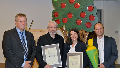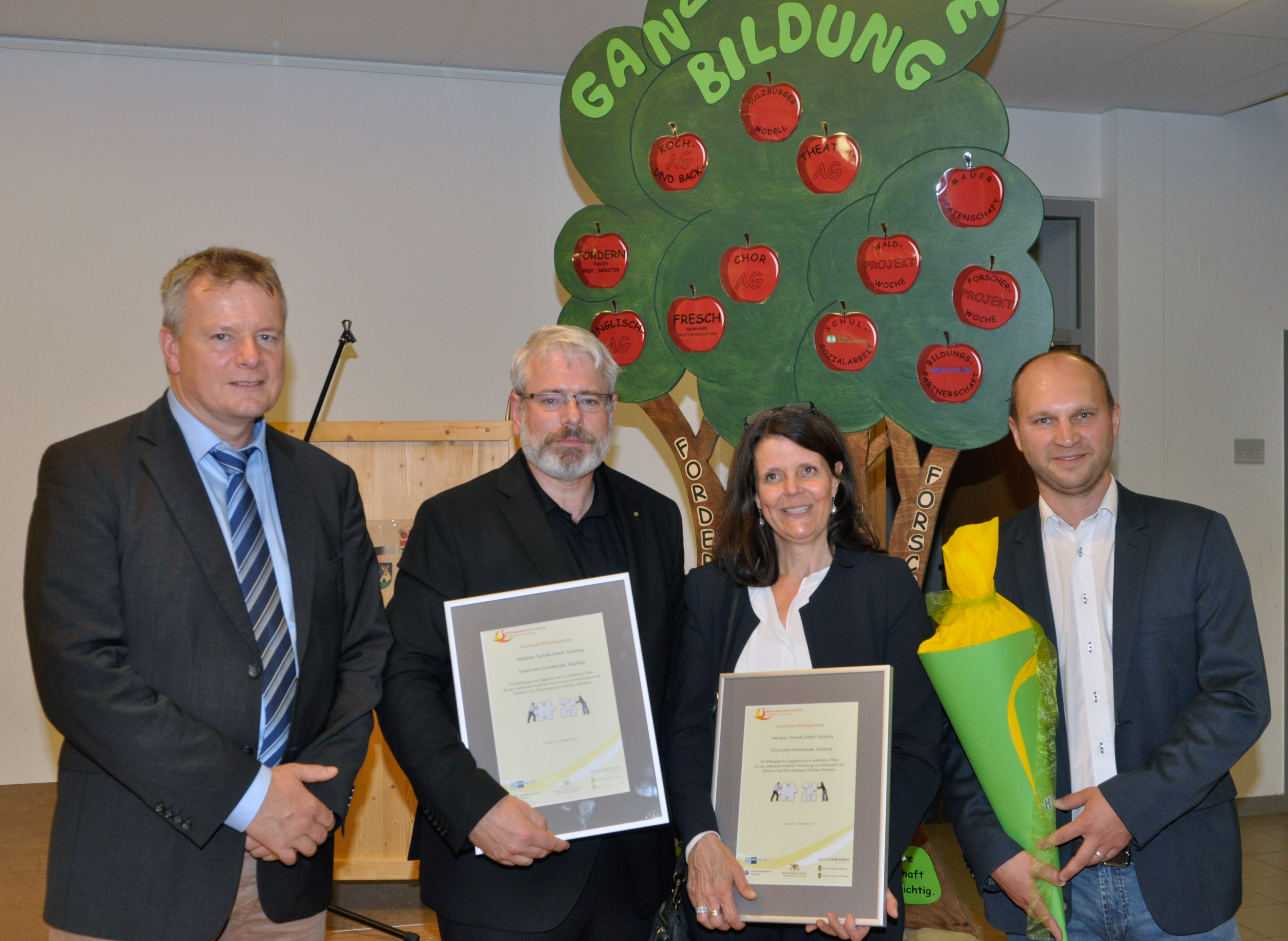 Die Bildungspartnerschaft ist besiegelt. Bürgermeister Dirk Blens, Michael Roth, Geschäfstführer der Hekatron Technik GmbH, Stefanie Müller, Rektorin der Ernst-Leitz-Grundschule und Heaktron Ausbildungsleiter Eugen Rempel (v.l.) Rempel erhielt von den Schülern zum "ersten Schultag" eine gut gefüllte Schultüte.
