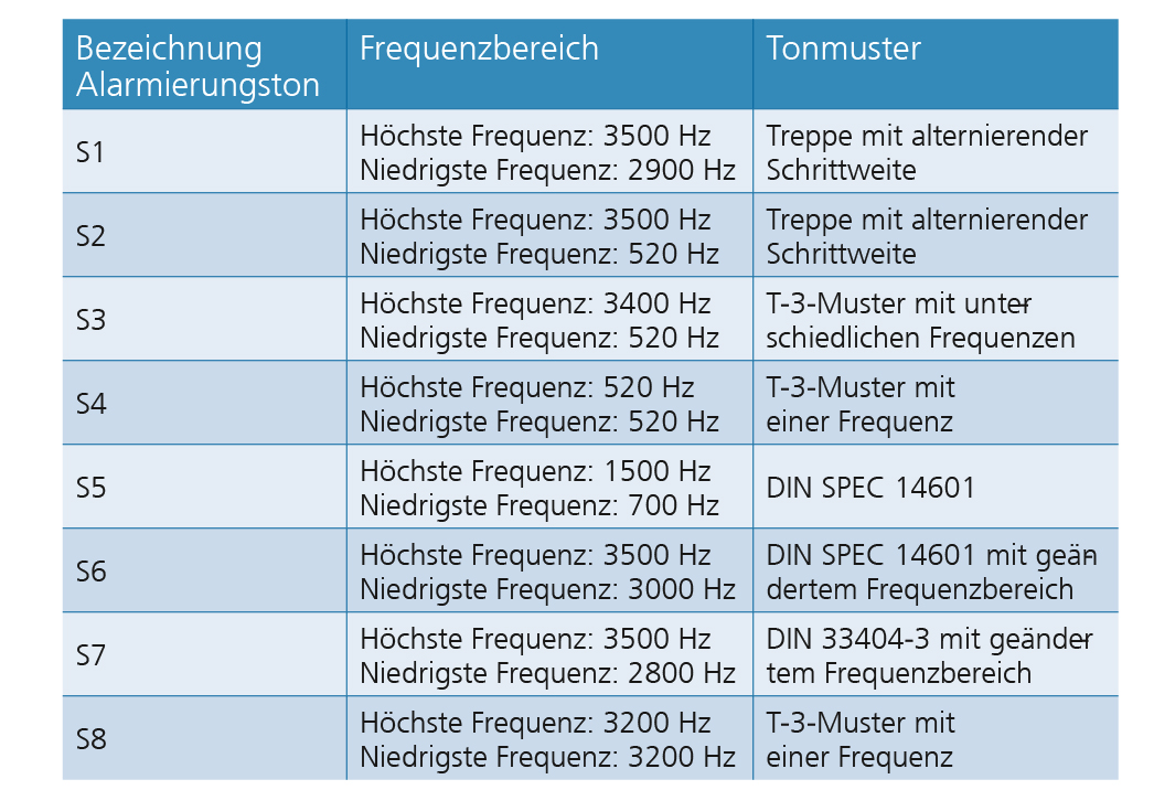 „Die Ergebnisse zeigen, dass ein Alarmton dann besonders gut wahrgenommen wird, wenn er unmittelbar als typische Warnung zugeordnet werden kann und zudem einen hohen Erregungsgrad bewirkt, Menschen also emotional direkt anspricht. Sirenenähnliche Tonmuster und solche mit alternierenden Schrittweiten zeigen im Zusammenhang mit Brandalarmen in der Studie die höchste Wirksamkeit“, fasst der Wissenschaftler zusammen. Erneut erwies sich ein breites Frequenzspektrum mit hohen und tiefen Frequenzen zwischen dem Bereich unterhalb von 1000 Hertz und oberhalb von 3000 Hertz als effektiv, um die emotionale Reaktion zu verstärken und auch Menschen mit altersbedingten Hörverlusten zu erreichen. In den Versuchen zeigten sich drei der acht getesteten Tonmuster besonders wirkungsvoll (S2, S5 und S7, s. Tabelle). Der Ton S3, eine Pieptonfolge (T-3 Muster mit unterschiedlichen Frequenzen), dagegen wirkte nur mäßig effektiv, weil er leicht mit anderen Umgebungsgeräuschen verwechselt werden kann.