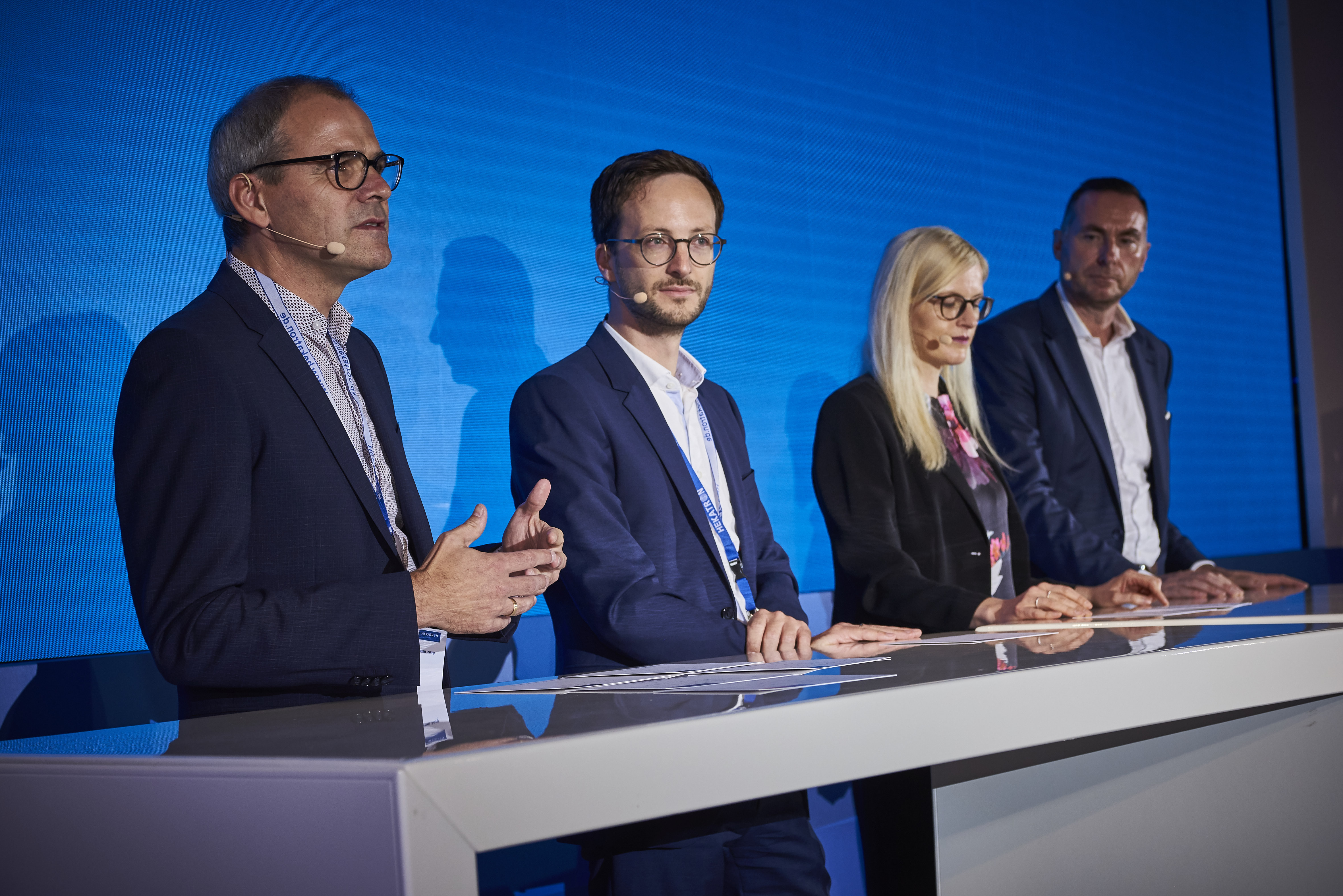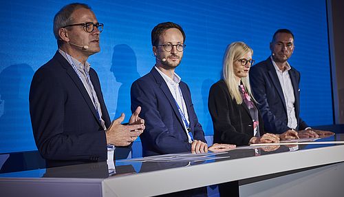 Hartmut Dages, Geschäftsbereichsleiter Produktmanagement, Tobias Fuchs, Leiter digitale Transformation und Technologien, Petra Riesterer, Director Product Management International bei der Securitas Gruppe Schweiz sowie Christian Rudolph, Gesamtvertriebsleiter stellen sich in der Podiumsdiskussion den Fragen rund um das neue Serviceportal Mein HPlus