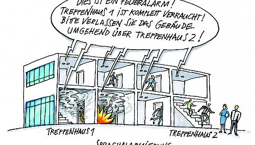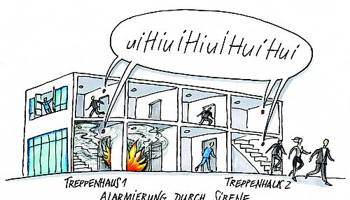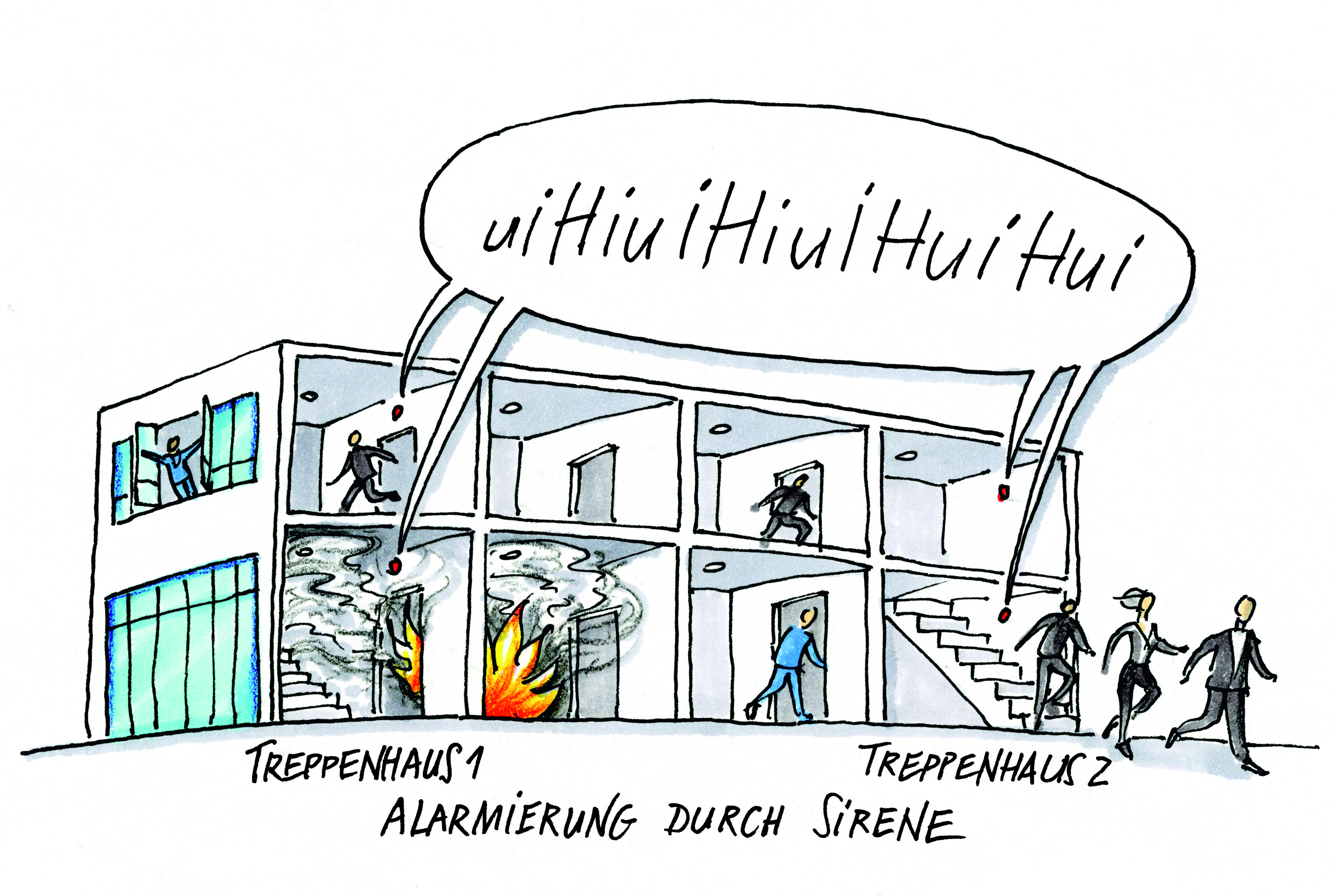 Alarmierung mittels reiner Tonsignale durch Hupen lässt die Gebäudenutzern im Unsicheren.