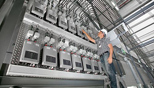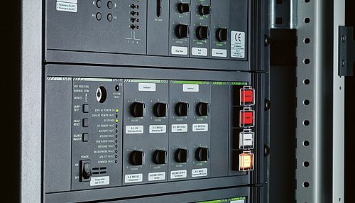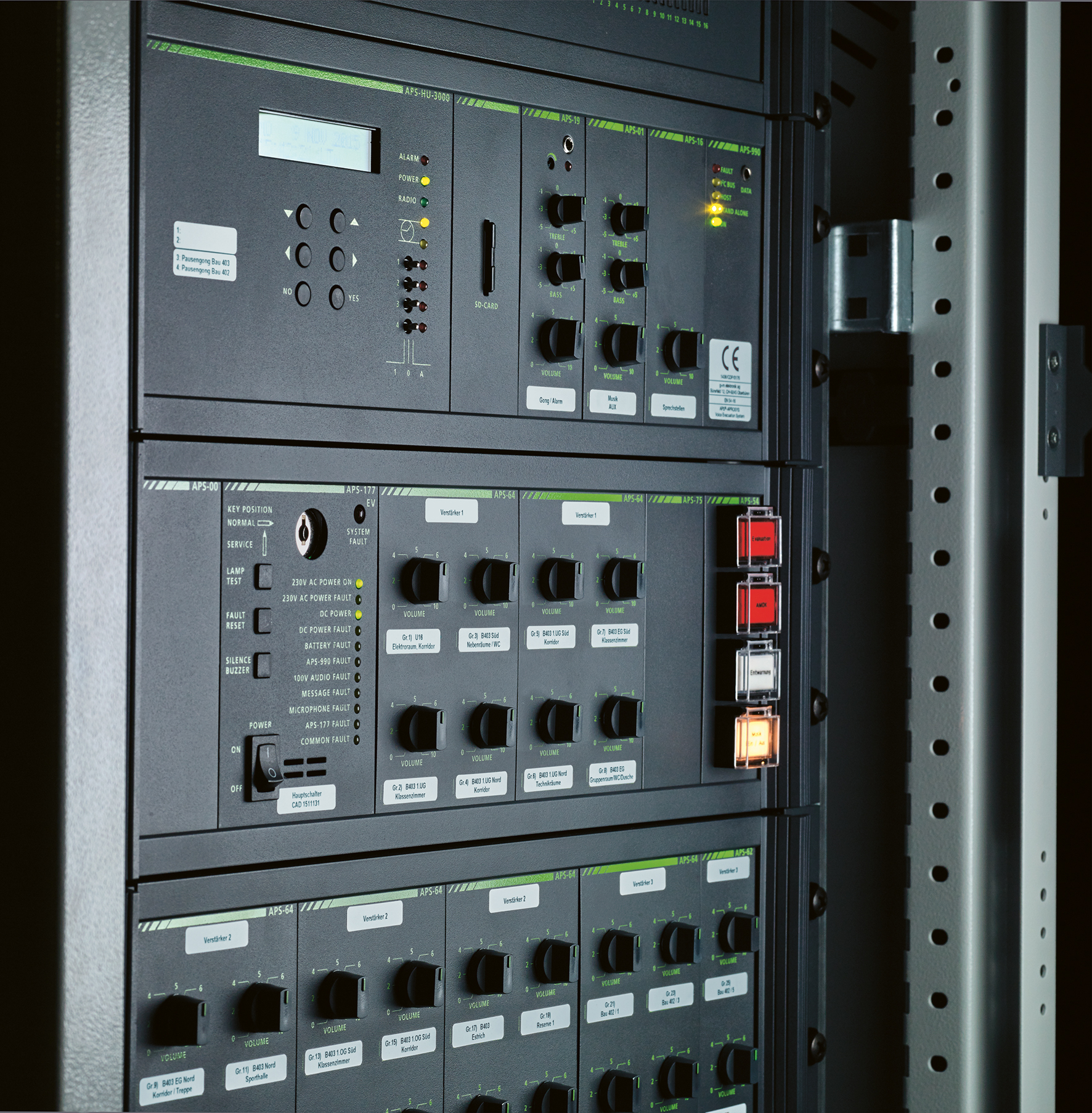 Modular aufgebautes Rack einer Sprachalarmanlage von Hekatron Brandschutz