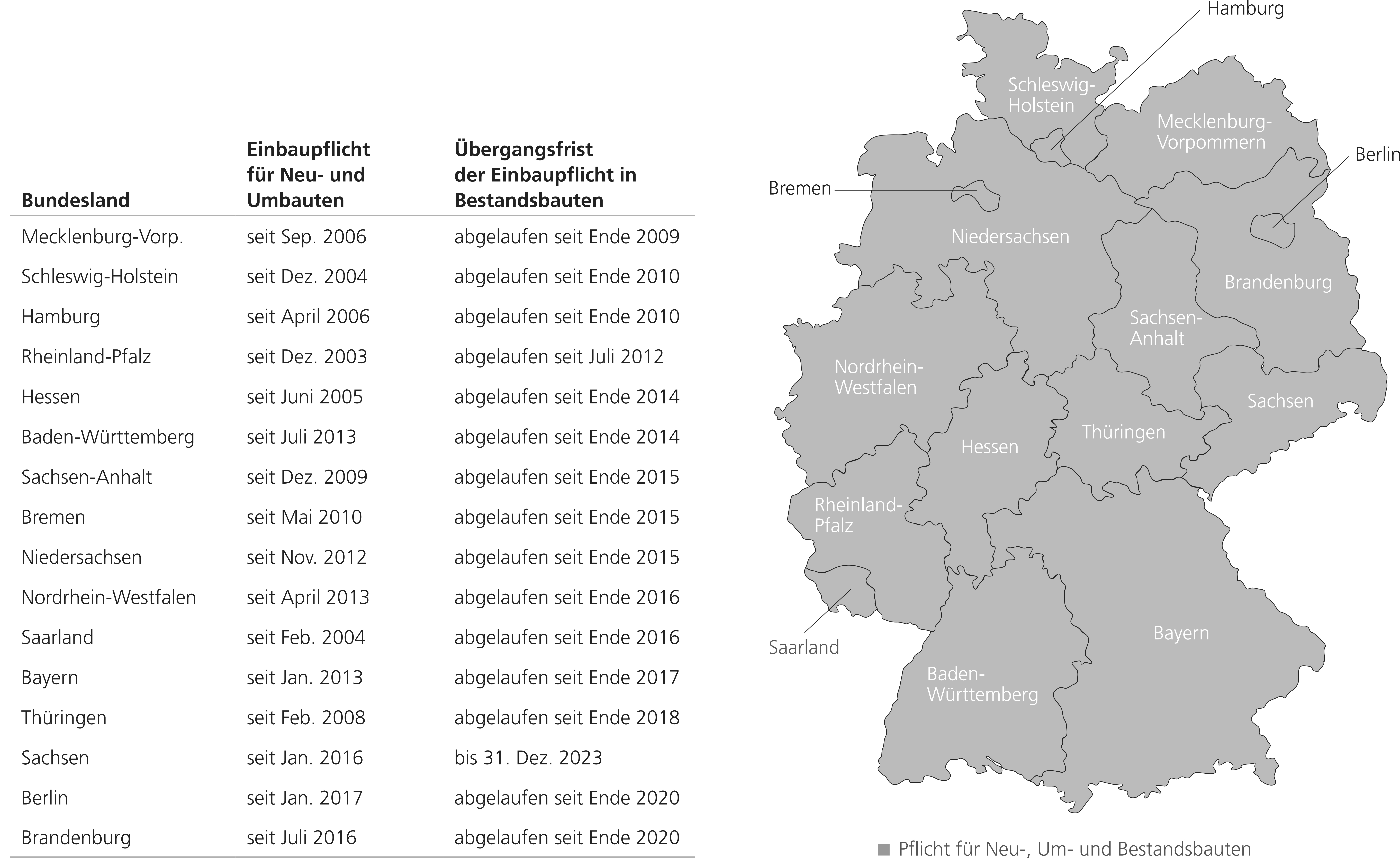 Seit 2003 wurde die Rauchwarnmelderpflicht in Deutschland nach und nach in den Landesbauordnungen verankert. Meist galten großzügige Übergangsfristen von mehreren Jahren. In einigen Bundesländern liegt dieses Fristende heute bereits mehr als zehn Jahre zurück, so in Mecklenburg- Vorpommern (2009), Schleswig-Holstein und Hamburg (2010) sowie Rheinland-Pfalz (2012). In Baden-Württemberg und Hessen jährt sich das Ende der Übergangsfrist 2024 zum zehnten Mal. Weil gemäß der Anwendungsnorm DIN 14676-1 Rauchwarnmelder spätestens zehn Jahre und sechs Monate nach dem Datum der Inbetriebnahme ausgetauscht werden müssen, sollten die Melder der ersten Stunde in diesen Regionen entsprechend durch neue ersetzt werden. Grund dafür ist, dass die damals montierten Geräte heute nicht mehr dem aktuellen Stand der Technik entsprechen und nicht mehr genug Sicherheit bieten. Die Melder sind nach dieser langen Zeit oft stark verschmutzt und möglicherweise nicht mehr betriebsbereit.