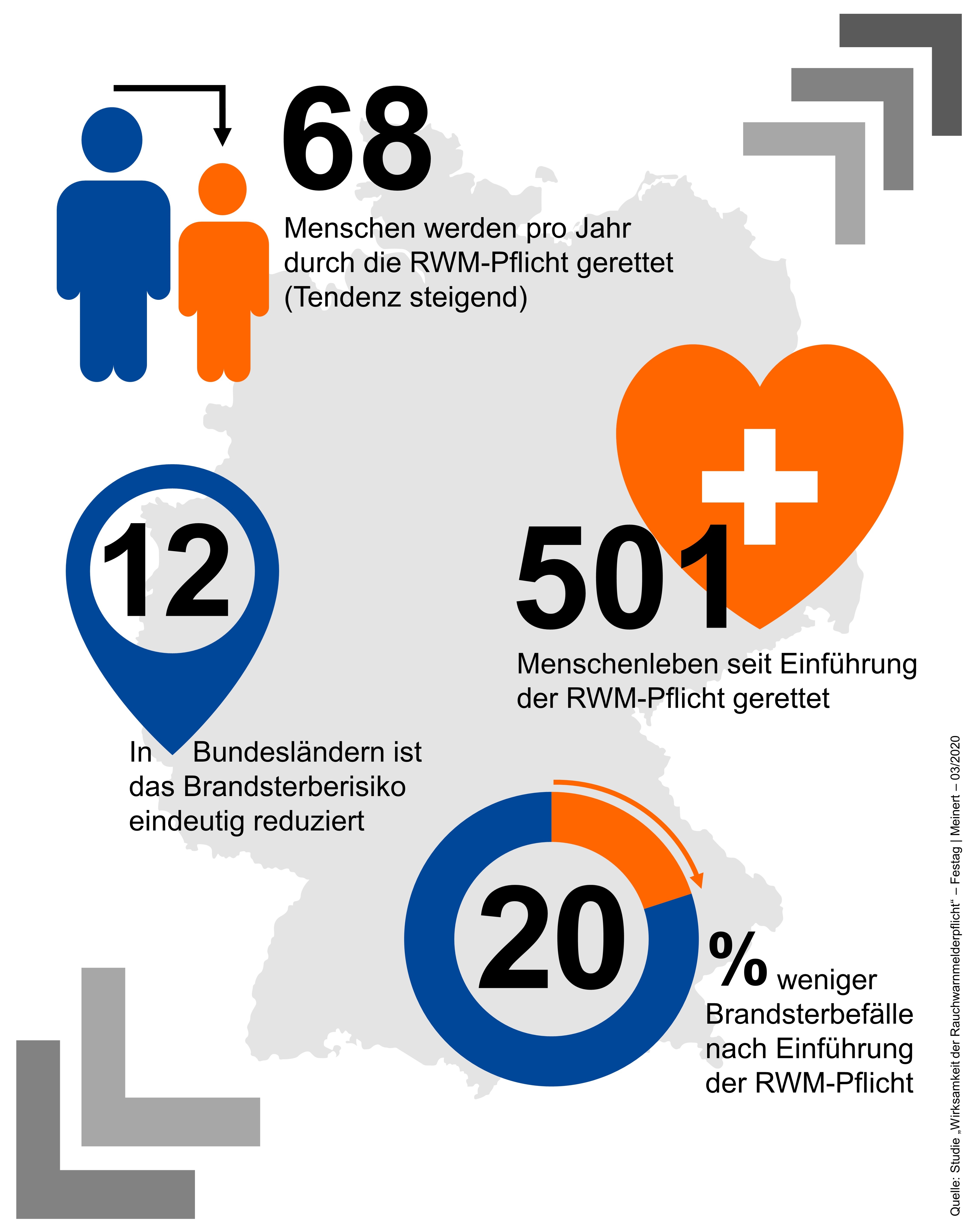 So unübersichtlich die bundesweiten Regelungen auch sein mögen, so wirkungsvoll ist die Einführung der Einbaupflicht als Ganzes. Die Studie „Wirksamkeit der Rauchwarnmelderpflicht“ des Risikoforschers Dr. Sebastian Festag und Dr. Marion Meinert belegt, dass sich die Zahl der Brandsterbefälle seit Einführung der Pflicht bis zum Jahr 2020 bereits um 20 Prozent reduziert hat. Tendenz steigend.