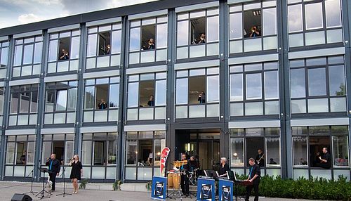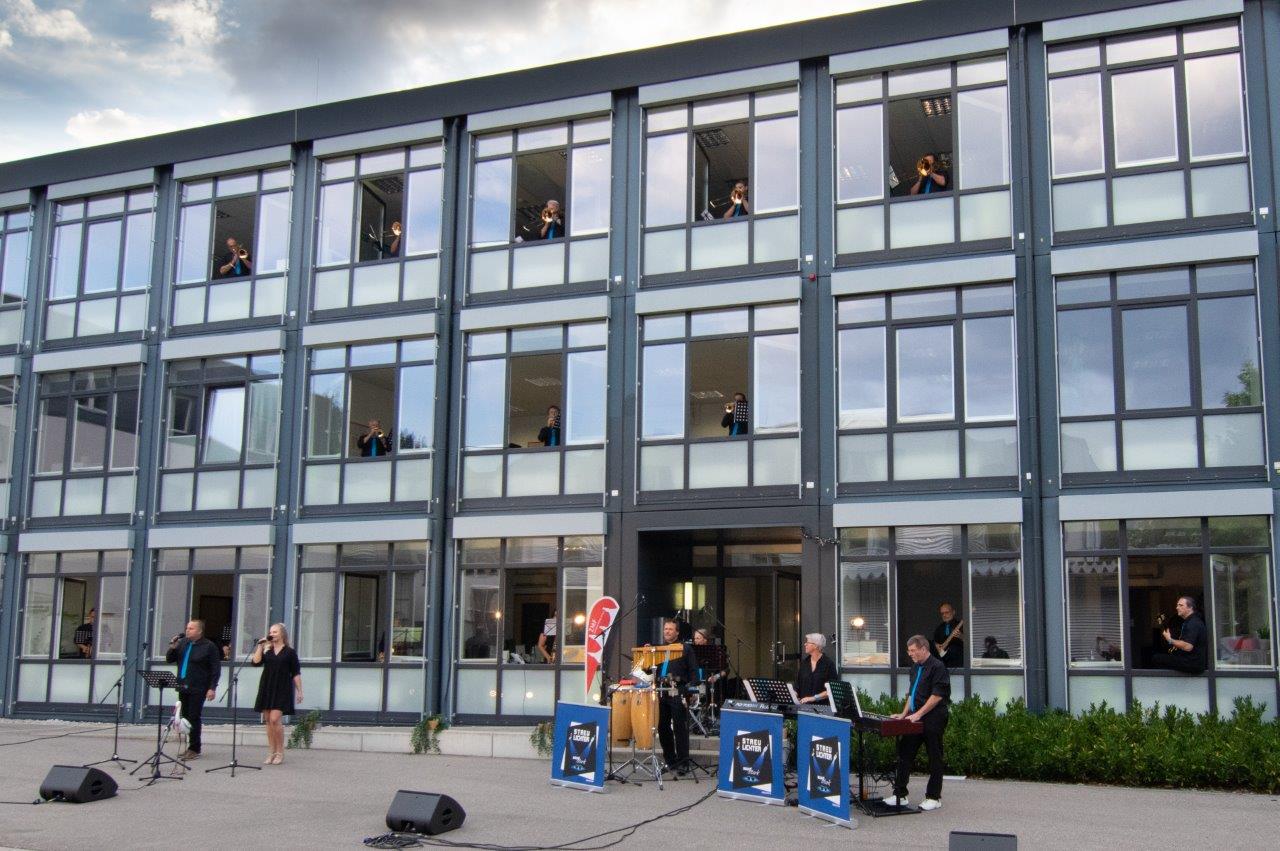 Bei Hekatron hatte man eine originelle Idee, das Konzert unter Einhaltung der Abstandsregeln durchzuführen. Man nehme: Ein ausreichend großes Bürogebäude, genügend Fenster, einen Musiker pro Fenster – und fertig ist die Bühne. Beim Konzert spannten die Streulichter einen weiten musikalischen Bogen. Vom Cab-Calloway-Jazzklassiker „Minnie the Moocher“ über Deep Purples „Smoke on the Water“ bis hin zum James-Bond-Song „Skyfall“ war für jeden Musikfreund etwas dabei.